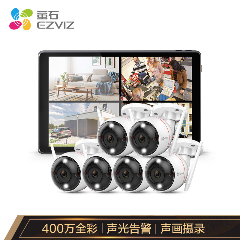 萤石摄像头 400万极清无线全彩WiFi监控套装 C3W4MP+64G卡+SD1 6台摄像机智能屏套装 自营