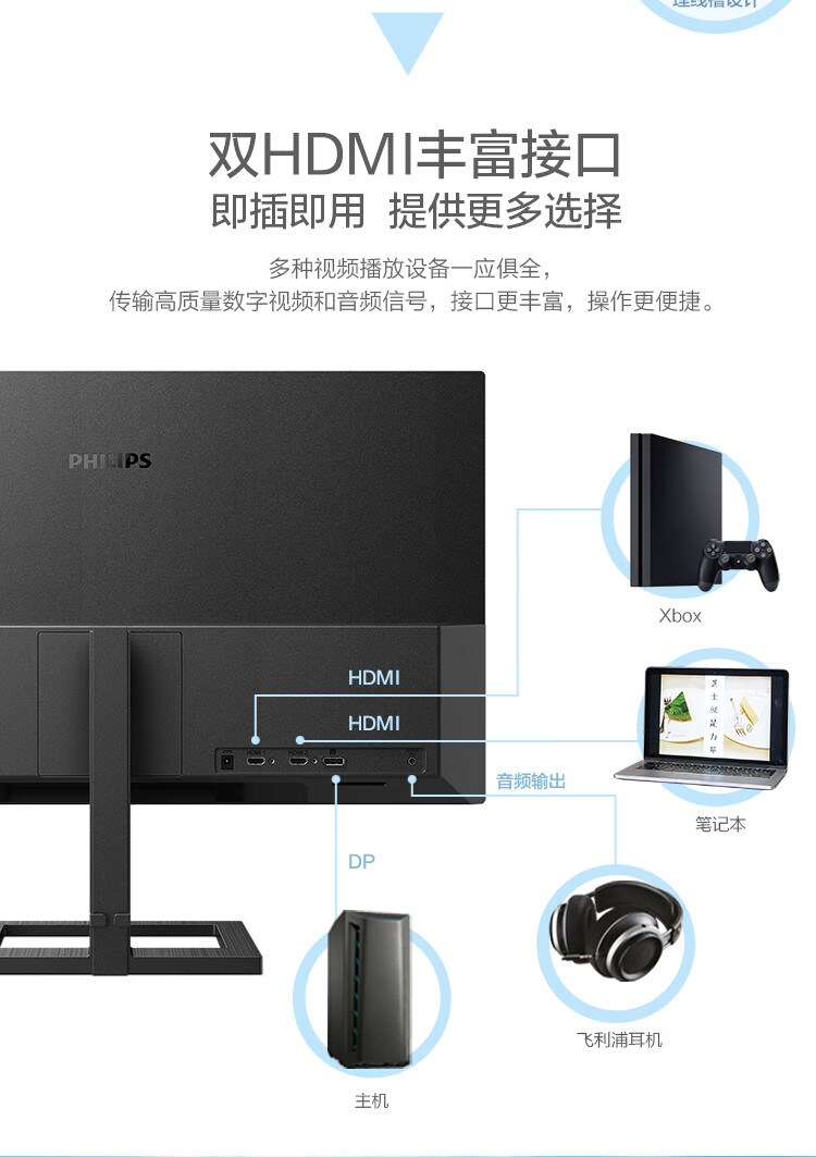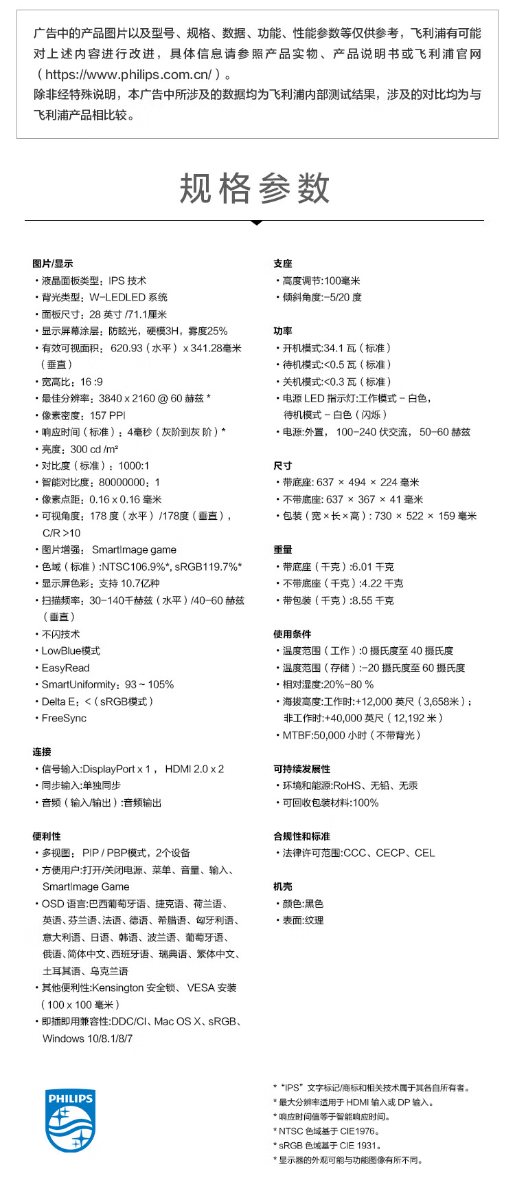 飞利浦 28英寸显示器 电脑显示屏 4K显示器 IPS sRGB119.7% 10.7亿色彩专业设计升降 电脑PS5显示器 288E2E 自营