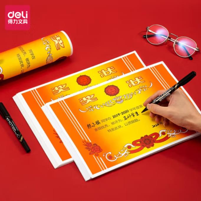 得力(deli)A4奖状纸获奖证书 有字款中小学生表扬表彰奖状教师通用 加厚铜版纸 50张/(包)24827 自营