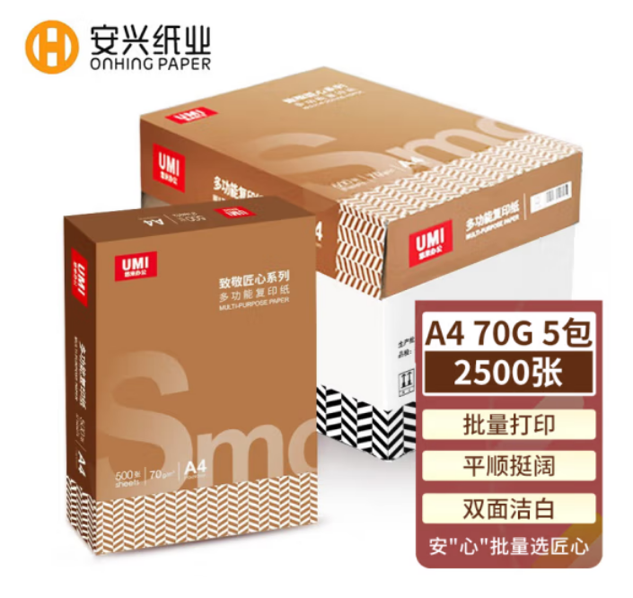 安兴 匠心A4打印纸70g复印纸多功能办公家用A4纸双面电打纸 草稿纸整箱热销70克 500张/包 5包/箱(2500张) 自营